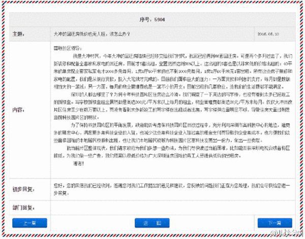 據深圳南山區官網的書記信箱顯示,有自稱是南山區大沖村的村民表示,自家分到了66套回遷房。經過配備家私和裝修,但目前只出租出去了5套。村民稱,所有這些房子裝修和家電的配置,是從銀行貸款,投入大筆錢才完成的,他們面臨巨大的壓力:一方面貸款和利息的支付,每月都是數額相當大的一筆錢;另一方面,每月的物業管理費也是一筆不小的開支;目前出租的幾套物業,連生活費都不能滿足。希望政府可以提供幫助解決。