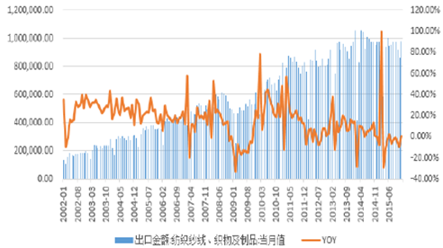 2002-2015年中國紡織紗線、織物及制品出口金額及同比增速