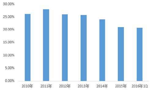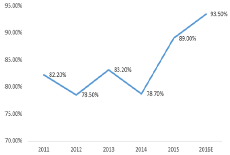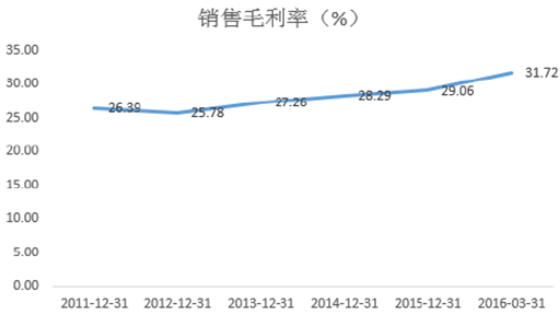 2011-2016年中國紡織服裝行業銷售毛利率