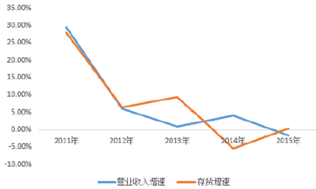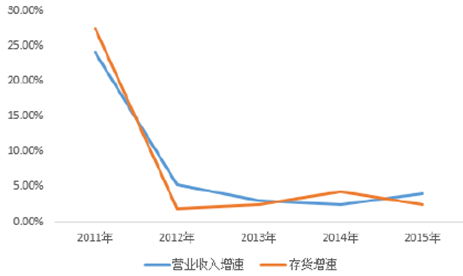 2011-2015年中國紡織服裝營收增速與存貨增速匹配