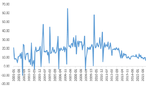 2001-2015年中國限額以上服裝鞋帽針紡織品類零售額YOY