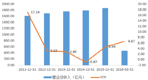 2011-2016年中國體育休閑主營收入