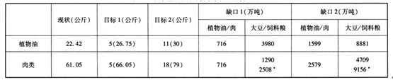 從全球的膳食習(xí)慣來(lái)看我們能清楚看出兩種不同模式:東亞類的中餐食品組合是飯與菜的結(jié)合,飯就是主食,菜則為肉類、蔬菜、水果、菌類等豐富組合,收入水平的高低往往表現(xiàn)在“菜”上。肉類往往和蔬菜、植物油結(jié)合,或者蔬菜與植物油結(jié)合,飯(米或者面)和不同菜完成豐富的“菜食譜系”,屬于節(jié)約土地的節(jié)糧型食物消費(fèi)。美歐或者說(shuō)西方的典型西餐食品組合是肉類+奶類+飲料的食品組合,對(duì)于肉類和奶類的消費(fèi)顯著偏高。由此可見(jiàn),不同消費(fèi)模式的選擇會(huì)顯著影響著未來(lái)大陸的食品消費(fèi)格局。準(zhǔn)確地說(shuō),上述兩種模式并不是完全僵固的,以日本為例,傳統(tǒng)日本食品消費(fèi)主要是以大米、蔬菜、魚、大豆為主典型的“醬湯泡飯”,但是后來(lái)越來(lái)越西化,出現(xiàn)了豐富的肉類、牛奶及奶制品、油脂、水果等,呈現(xiàn)一種多樣化、富營(yíng)養(yǎng)的飲食生活模式,食物消費(fèi)結(jié)構(gòu)與膳食營(yíng)養(yǎng)構(gòu)都發(fā)生了實(shí)質(zhì)性變化。可以預(yù)見(jiàn)未來(lái)大陸的食品消費(fèi)介于中餐和西餐之間,為此,本研究在匡算植物油和肉類缺口時(shí),既參考中餐膳食模式,也參考了西方西餐膳食模式,以大陸消費(fèi)現(xiàn)狀與國(guó)外曾經(jīng)達(dá)到的最高水平之間差距作為消費(fèi)缺口。