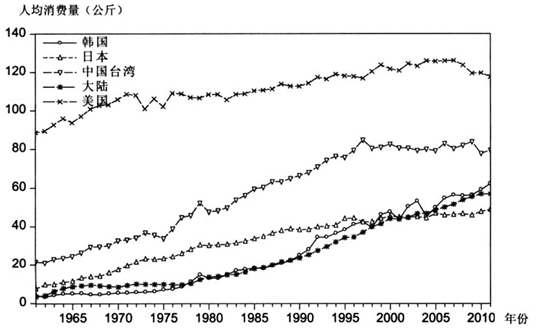 中國(guó)臺(tái)灣、日本和韓國(guó)肉類人均肉類(包含了水產(chǎn)品)消費(fèi)