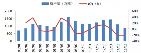 中國糖產量超預期減產。2015年11月,全國糖產銷工作會議預計15/16榨季全國產糖將減產至1000萬噸左右;美國農業部駐中國參贊公布的最新報告顯示,中國15/16年度糖產量或下降215萬噸,至840萬噸。糖減產超預期,產消缺口增大至約660萬噸。