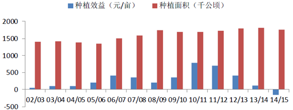 2002-2015年中國甘蔗種植效益及種植面積統計