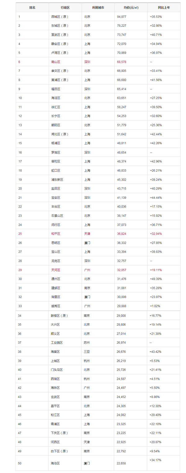 如果把排名單位由"城市"換成"行政區",統計口徑更小,可能更有參考價值。這是中國房價行情數據平臺5月份公布的數據——全國房價最貴的50個行政區。該平臺由中國房地產協會運營,其數據具備相當的權威性。