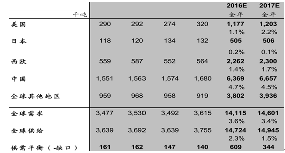 全球鋅行業在礦山關停的情況下供應或趨緊,鋅價趨勢向好。預計全球鋅市場2016 年和 2017 年分別過剩約 60.9 萬噸和 34.4 萬噸,LME2016 年和 2017 年鋁均價分別為 1,890 美元/噸和 2,100 美元/噸。