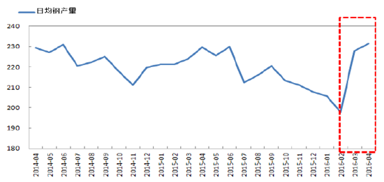 進入2016年鋼鐵行業開始出現回暖,許多廠商開始復產。從鋼廠生產情況來看,16年3月,中國粗鋼日均產量227.9萬噸,較2月增長15.21%,4月粗鋼日均產量繼續增長達到231.4萬噸,超過2014年6月高點。