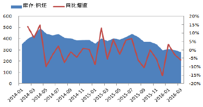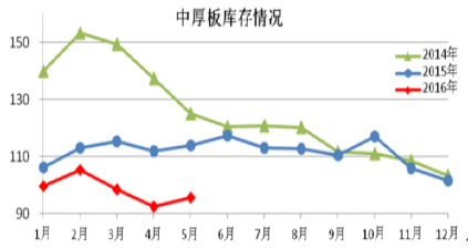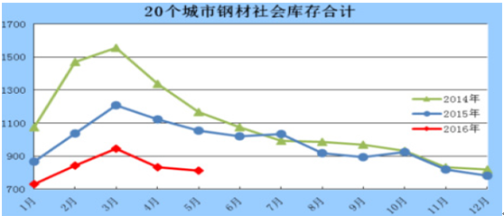 根據中國鋼鐵工業協會統計,2016年5月,全國20個城市5大類品種鋼材社會庫存合計環比繼續下降,尤其長材產品庫存全部下降,板材產品庫存略有上升。5月鋼材的社會庫存為811.6萬噸,環比減少20.28萬噸,下降2.44%。其中鋼材市場庫存總量712.5萬噸,比上月減少33.12萬噸,下降4.44%。同時,鋼廠鋼材庫存也在一季度有所下降,3月鋼廠鋼材庫存1319.20萬噸,環比二月下降10%,而一季度庫存總量也相對去年同比下降了17.05%。