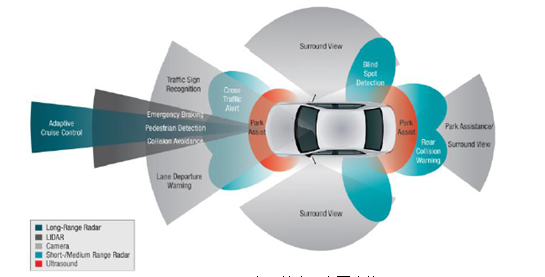 ADAS作為車輛智能化的初級階段產品,有望率先普及商業化。根據技術條件和產業化發展階段,目前處于輔助駕駛向半自動駕駛推進的階段,ADAS作為過渡產品預計將率先普及。主要的ADAS技術包括自適應巡航ACC,車道偏離預警LDW,車道保持輔助LKA,前裝預警FCW,自動緊急制動AEB,盲點探測BSD,自動泊車AP等。