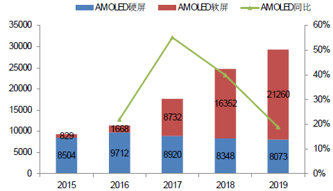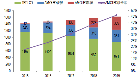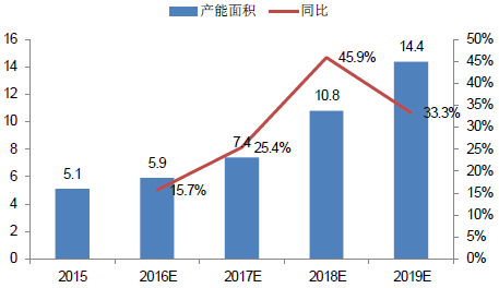 2015-2019年AMOLED產能面積測算(百萬平方米)