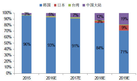 2016年全球中小尺寸AMOLED面板產能中,韓系面板廠的占比仍獨占鰲頭,達93%。在此波面板升級中,中國大陸走在前列,超過日本和臺灣。相比LCD時代,大陸切入LCD市場時,其產業鏈已經較為成熟。AMOLED此波技術升級中,大陸僅次于韓國,面臨著更大的機遇。第三方數據預估2019年韓系面板廠產能的全球占比將下滑至71%,而中國面板廠則有機會攀升至19%。