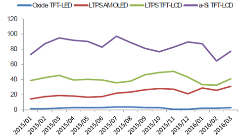 2015-2016年中國智能手機面板分技術類別出貨量(百萬片)