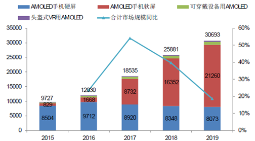 2015-2019年AMOLED總體市場規模測算(百萬美元)