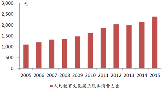瑞信發(fā)布的“2015 全球財富報告”指出,中國家庭財富總值達(dá)22.8 萬億美元,超過日本躍居世界第二富裕國家,僅次于美國;同時,中國擁有全球最龐大的中產(chǎn)階層人口,達(dá)1.09 億人,超越美國的9200 萬名中產(chǎn)階層人數(shù)。中產(chǎn)階級的消費觀更加成熟,追求生活的品質(zhì)和精神追求,他們不僅愿意為產(chǎn)品的品質(zhì)支付高的溢價,并且非生活必需品的消費占比越來越大。中產(chǎn)階級的崛起顯著促進(jìn)了娛樂文化消費,2005 年以來,受惠于人均收入增加和消費習(xí)慣養(yǎng)成,中國居民人均教育文娛消費支出保持良好增長態(tài)勢,由2005 年的1097 元逐步攀升,十年間已增長117%。2015 年居民人均在教育文娛服務(wù)的消費支出較2014 年同比增長11%至2,383 元,而2015 年居民人均年消費支出金額為21,392 元,相比2014 年增幅7%,可見文娛相關(guān)產(chǎn)業(yè)消費占比正快速提升。
