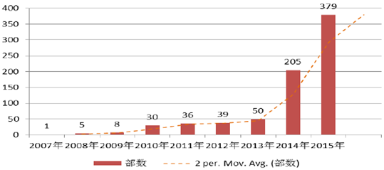 網(wǎng)劇數(shù)量呈指數(shù)增長,已追平傳統(tǒng)電視劇產(chǎn)量。2015 年網(wǎng)絡(luò)劇總部數(shù)379 部,增加了85%,網(wǎng)絡(luò)劇全年播放量達(dá)274.5 億,比2014 年的123 億增加了1.1 倍,總部數(shù)379 部,總集數(shù)5,008 集,增加了72%,網(wǎng)劇業(yè)得到了爆發(fā)式成長。2015 年網(wǎng)劇的部數(shù)已經(jīng)和傳統(tǒng)電視劇處于同一個量級,相差無幾。在集數(shù)的維度上,網(wǎng)絡(luò)劇多屬于迷你劇,基本處于15-25 集的范圍內(nèi),多以季播劇的形式來替代超長劇。