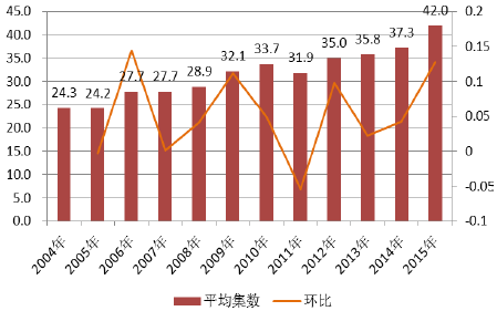 電視劇量降質(zhì)升,精品劇成主流。根據(jù)廣電總局?jǐn)?shù)據(jù)顯示,2015 年電視劇部數(shù)為394部,已經(jīng)降至自2004 年以來最低水平。同時,2015 年總集數(shù)維持穩(wěn)定增長,增速3.5%。電視劇的數(shù)量和集數(shù)形成缺口,主要原因在于“一劇兩星”政策下傳統(tǒng)電視劇開機量下降,導(dǎo)致電視劇產(chǎn)量下降。軟性廣告的需求推動單部劇的集數(shù)上升,電視劇走向精品劇路線。從數(shù)據(jù)表現(xiàn)看,電視劇平均集數(shù)與十年前相比增長近一倍,從2004 年的平均24.3集/部升至2015 年的平均42.0 集/部。電視劇的集數(shù)上升已成趨勢,近年來的爆款作品也可以提供直觀感受:《花千骨》共58 集,《甄嬛傳》共76 集,《羋月傳》共81 集,《武媚娘傳奇》共96 集。
