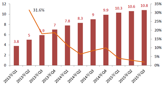 我國視頻行業(yè)高增長,但競爭激烈同質(zhì)化嚴(yán)重。從產(chǎn)業(yè)鏈的角度,視頻網(wǎng)站處于產(chǎn)業(yè)中游,屬于播放渠道。隨著渠道的日益豐富,渠道資源不再稀缺,而優(yōu)質(zhì)IP 的價值日益凸顯,網(wǎng)絡(luò)視頻與網(wǎng)絡(luò)文學(xué)、動漫、游戲、影業(yè)等內(nèi)容行業(yè)之間的聯(lián)系也越來越緊密,有利于內(nèi)容的變現(xiàn)和二次收益。近年來,中國網(wǎng)絡(luò)視頻用戶數(shù)量和市場規(guī)模不斷擴大,持續(xù)高增長。網(wǎng)絡(luò)視頻用戶數(shù)2015 年達(dá)5.04 億,同比增長16%,使用率為73.2%。其中,手機視頻用戶數(shù)4.05 億,同比增長29.5%,手機端依然是網(wǎng)絡(luò)視頻用戶規(guī)模增長的主要推動力,手機網(wǎng)絡(luò)視頻使用率達(dá)65.4%,同比增長9.2 個百分點。