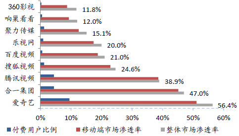 我國網(wǎng)絡(luò)視頻行業(yè)規(guī)模2015 年超過400 億元,同比增長>60%,ARPU 值明顯提升,預(yù)測2018 年市場規(guī)模會達(dá)到甚至超過1000 億。國內(nèi)前幾大視頻網(wǎng)站市場份額差距并不太大,從主要品牌滲透率看,2015 年愛奇藝整體市場滲透率排第一,為56.4%;合一集團(優(yōu)酷土豆)排第二,為47%;排名第三的是騰訊視頻,滲透率38.9%。愛奇藝在手機端的市場滲透率也最高,為51.1%,但和二、三名差距不算太大。從付費用戶比例的角度,愛奇藝領(lǐng)先較多,有先發(fā)優(yōu)勢。從年平均活躍用戶角度,排在前三的分別是騰訊、優(yōu)酷土豆和愛奇藝,各自對應(yīng)1.08 億、1.06 億和9613 萬人,差距較小。同時,這三大國內(nèi)視頻網(wǎng)站背后均各自對應(yīng)國內(nèi)三大互聯(lián)網(wǎng)巨頭:騰訊自有騰訊視頻;百度于2013 年收購PPS 視頻業(yè)務(wù),并將其與愛奇藝合并;阿里2016 年4 月完成對優(yōu)酷土豆的全資收購,同時優(yōu)酷土豆從紐交所退市。一定程度上而言,巨頭在互聯(lián)網(wǎng)的全盤競爭同時帶動了視頻網(wǎng)站的競爭。