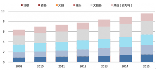 上年能繁母豬平均存欄數(shù)(萬頭)PSY全年生豬供應(yīng)量測算(萬頭)2010488813.65667002011472913.99661702012478914.54696282013499014.34715572014501014.67735102015E459015.50711492016E407817.00693222009-2016年我國主要領(lǐng)域豬肉需求量測算:萬噸