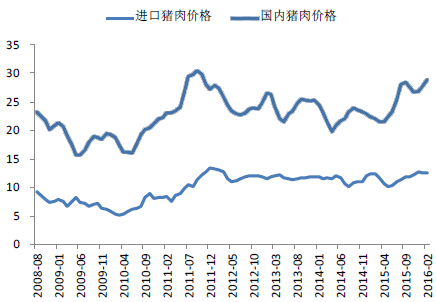 2008-2016年國內(nèi)外豬肉價格走勢圖