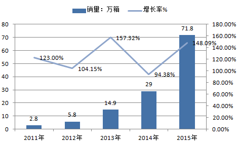 2011年~2015年全國細支卷煙銷量及增長率走勢