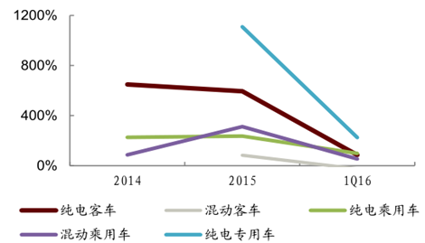 2013 年國內(nèi)純電動(dòng)客車產(chǎn)量僅 1,700 輛,而 2015 年這一數(shù)據(jù)就被刷新到了 8.8 萬輛,年均增速超 600%。2015 年,我國生產(chǎn)了純電動(dòng)專車 8.8萬輛,插電混動(dòng)客車 2.4 萬輛。2016 年 1 季度,純電動(dòng)客車和純電動(dòng)專車的產(chǎn)量增速依然分別保持 84.4%/34.0%的快速發(fā)展。