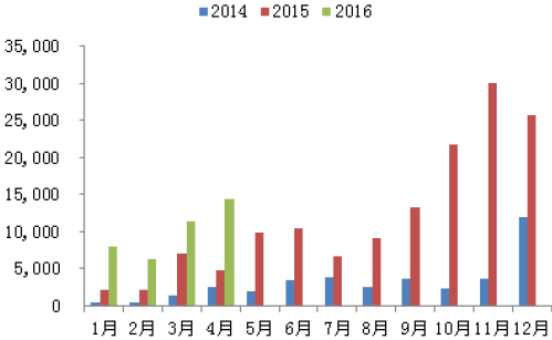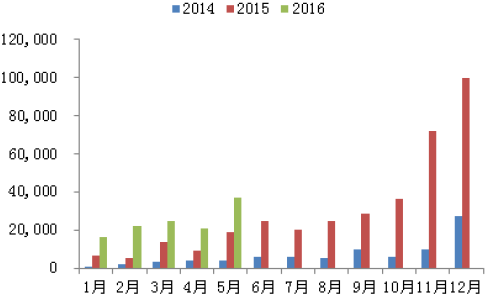 2014年1月-2016年5月新能源汽車月度產(chǎn)量