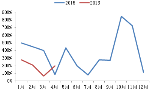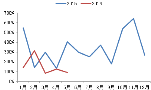 2014年1月-2016年5月新能源汽車月度產(chǎn)量同比增速