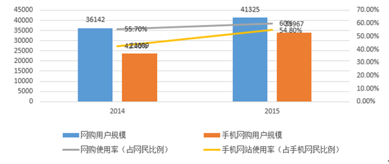 2014-2015年網(wǎng)絡(luò)購(gòu)物/手機(jī)網(wǎng)絡(luò)購(gòu)物用戶(hù)規(guī)模及使用率