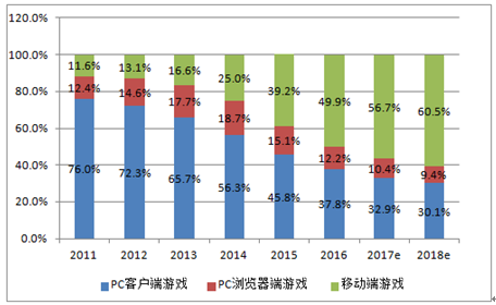 移動游戲份額增長至39.2%,端游份額自2016年跌落50%以下,移動游戲成為推動網絡游戲行業增長的主要動力。預計整個市場會在2016年出現拐點,移動市場份額將首次超過端游,成為最大的細分市場。
