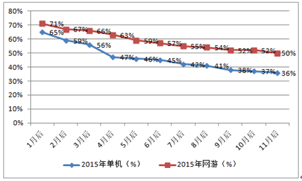 2015年移動游戲整體留存率相對較平穩,網游留存率相比2014年有較大幅度提升,對比單機游戲和網絡游戲的產品留存率可以發現,網絡游戲的留存率一直高于單機游戲,在11個月后,兩者的差距達到14%。由于網易、盛大、巨人等端游大廠的積極轉型,2015年很多 端游改編的移動端網游上線 ,使得手機網游無論在研發、運營、渠道上都有較大提升。另一方面,單機游戲依舊在靠前幾年的老牌游戲支撐, 沒有新單機大作出現 ,后續力量略顯疲軟。