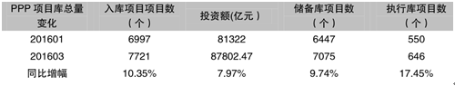 截至 2016 年 1 季度末,財政部 PPP 項目庫入庫項目 7721 個,合計投資額約 8.78 萬億元;其中在儲備庫中的項目數為 7075 個,完成合同簽署進入執行階段的項目數 646 個,進入執行庫項目占比 8.37%。