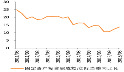 核心提示:2016 年 1 季度 GDP 同比增速 6.7%,季度數據同比及環比都呈持續下行態勢。固定資產投資數據對宏觀經濟的拉動效應較以前年度明顯下滑,短期投資數據向好,幵未形成對經濟持續改善的支撐。同期,固定資產投資數據尤其房地產開與投資數據表現2016 年 1 季度 GDP 同比增速 6.7%,季度數據同比及環比都呈持續下行態勢。固定資產投資數據對宏觀經濟的拉動效應較以前年度明顯下滑,短期投資數據向好,幵未形成對經濟持續改善的支撐。同期,固定資產投資數據尤其房地產開與投資數據表現相對較好,1 季度固定資產投資完成額同比增長 13.75%,較上年同期小幅下降 0.75 個百分點,環比 2015 年 4 季度提升 1.39 個百分點,環比顯著改善;2016 年 1 季度,房地產開與投資完成額同比增速 9.1%,一改 2015 年持續下行趨勢,環比提升 9.87 個百分點,同比下降幅度大幅收窄。