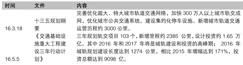 類別項目數金額(億元)擴建線路(公里)鐵路862000020000城市軌道交通103164782000公路5458006000水路10600-機場504600-合計3034747828000在《行動計劃》中城市軌交重點投資項目合計 103 個,合計投資規模約 1.65 萬億元,其中 2016 年 51 個,投資規模 9098 億元。國內已有城市軌道交通項目城市 28 個,其中 16 個城市在三年計劃中有新增重點項目,三年合計新建里程 1537 公里,投資規模 10836 億元。