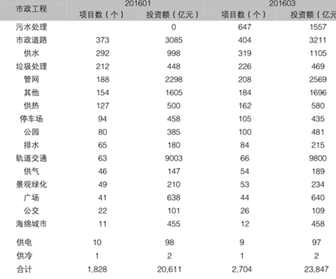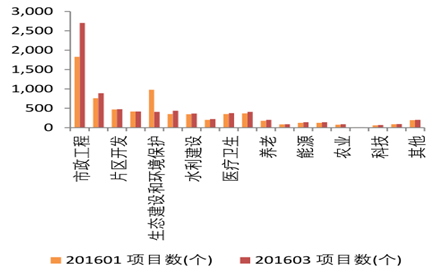 2016 年1-3 月 PPP 項目庫市政工程項目數及投資額明細
