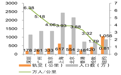 我國一線城市軌道交通里程總量前三城市分別為上海、北京和廣州,目前通車里程分別為 617 公里、554 公里和 261 公里,從每公里人口密度看,上述三個城市每公里人口數分別為 3.93 萬人/公里、3.88 萬人/公里和 5.18 萬人公里,與全球國際都市比較,上海北京人口密度與東京接近,但遠遠高于倫敦和紐約,倫敦、紐約每公里里軌交人口數分別為 1.79 萬人和 0.81 萬人。國內一線城市人口基數大,軌道交通建設仍有空間。