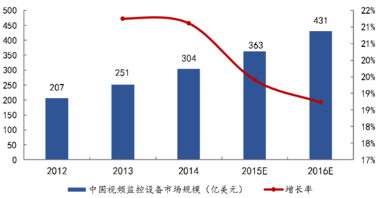 隨著國內安防行業的快速發展,作為安防行業的主要應用領域之一,安防視頻監控行業也獲得了快速發展。2014年,國內安防視頻監控設備的市場容量已經達到了 304 億元, 比 2012年的207億元增長了46.86%。2012年至2016年我國視頻監控設備市場容量年復合增長率將達到20.40%, 至2016年將達到431億元左右。