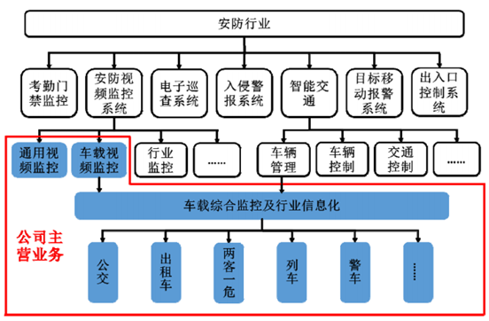 安防行業主要包括入侵警報系統、安防視頻監控系統、出入口控制系統、電子巡查系統、目標移動報警系統、報警通信指揮系統、考勤門禁系統等傳統安防產品,同時,隨著移動互聯網、物聯網、現代信息通信及控制等技術的快速發展及交通運輸行業對安全和效率提升的內在需求,智能交通成為了安防技術的重要應用領域。車載綜合監控信息化產品融合了智能交通技術和車載視頻監控技術,主要應用于公交車、出租車、 “兩客一危” 、軌道交通車輛、校車及警車等領域,屬于安防行業發展方向之一。