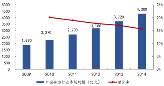 數據顯示,2014 年,中國安防行業市場規模從 2009年的1,890億元增長了 127.51%,達到了 4,300 億元,期間年復合增長率達到了 18%,市場規模獲得了較快增長。