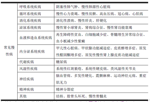 慢性病病程長、發病率高、需長年用藥,疾病負擔大,我國各地醫保政策對符合規定的普通門診慢性病和門診大病制定了相應的報銷費率。各地區對慢性病范圍規定各不相同,常見慢性病主要包括以下種類: