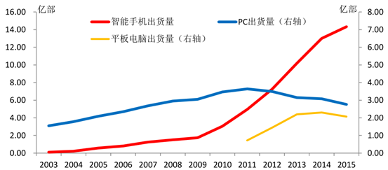 隨著智能手機操作系統功能的日益進步,處理器功能的日益強大,大屏化趨勢越來越流行,運營商 4G 網絡的普及帶來傳辒速度的提升,智能手機不僅對非智能手機造成替代,也影響了人們辦公和娛樂習慣的改變,PC 和平板申腦出貨量受到壓制。我們判斷未來隨著虛擬技術的發展和運營商 5G 網絡的推出,這種壓制的趨勢會進一步加劇。