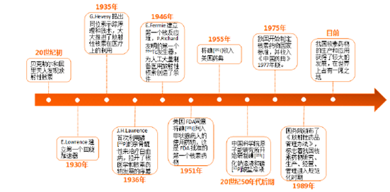 核心提示:一、核素藥物發展概況核醫學是一種利用標記有放射性核素的藥物診斷和治療疾病的科學,是核技術在醫學領域的應用,具有臨床價值高、壁壘高、增速高的“三高”特征。我國的核素藥物應用始于20世紀50年代后期,經過半個世紀的發一、核素藥物發展概況