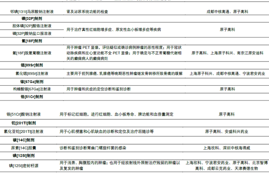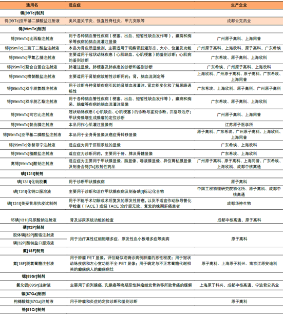 國內己經上市的主要的核素藥物