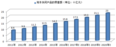 海洋休閑產品可分類為兩類:(1)肉類海洋休產食品(主要包括魷魚絲及烤鰻魚);(2)植物海洋休閑產品(主要包括海苔)。顯示:中國海洋休閑產品的零售總額由2011年的約人民幣86億元增加至2015年的約人民幣142億元,復合年增長率為約13.4%;隨著居民購買力的增強,消費者對營養健康及便利食品需求的增加,以及現代化零售網絡的發展,估計中國海洋休閑產品的零售總額將于未來五年繼續上升,2016年至2020年間的復合年增長率將為9.8%,于2020年將達到約人民幣230億元。