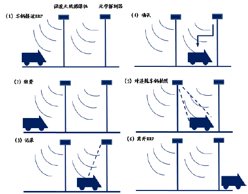ERP系統(tǒng)采用2.5Hz波段小范圍無(wú)線(xiàn)電系統(tǒng),由帶現(xiàn)金卡的車(chē)載單元(IU)、ERP顯示牌(或控制點(diǎn))、控制中心三個(gè)部分組成。交通系統(tǒng)數(shù)據(jù)庫(kù)中,每輛車(chē)有與之對(duì)應(yīng)的唯一車(chē)載單元ID,不同車(chē)型的車(chē)輛選用不同類(lèi)型的車(chē)載單元,系統(tǒng)根據(jù)車(chē)型和使用時(shí)段不同更新費(fèi)率。