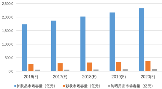 作為化妝品行業的主要子行業,護膚品、彩妝和防曬用品也將在未來幾年內呈現持續增長態勢。根據預測,至2020 年其市場容量將分別達到2,330.1 億元、369.4 億元和76.8 億元規模,2016 至2020 年年均復合增長率分別為7.7%、7.9%和9.2%。
