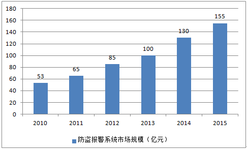 自2000年起,我國防盜報警行業呈快速發展,防盜報警器的銷售數量和總銷售額均以年均30%-60%的幅度高速攀升。2015年行業市場規模在155億元左右。