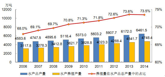 2006-2014 年中國水產(chǎn)品產(chǎn)量及其中養(yǎng)殖產(chǎn)量